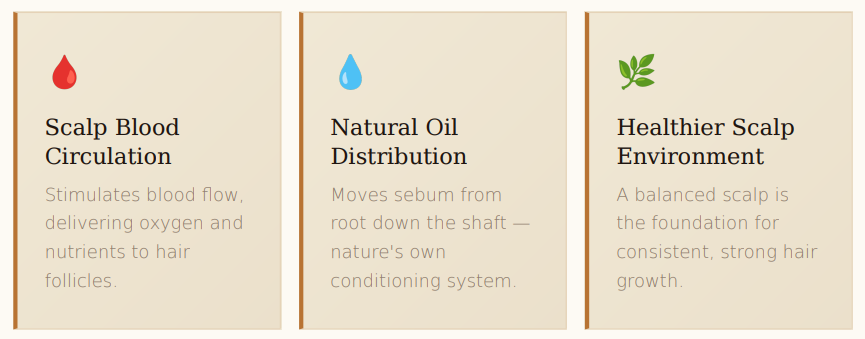 Your scalp is living tissue full of blood vessels and hair follicles that need consistent nourishment. When you comb with intention, something shifts.